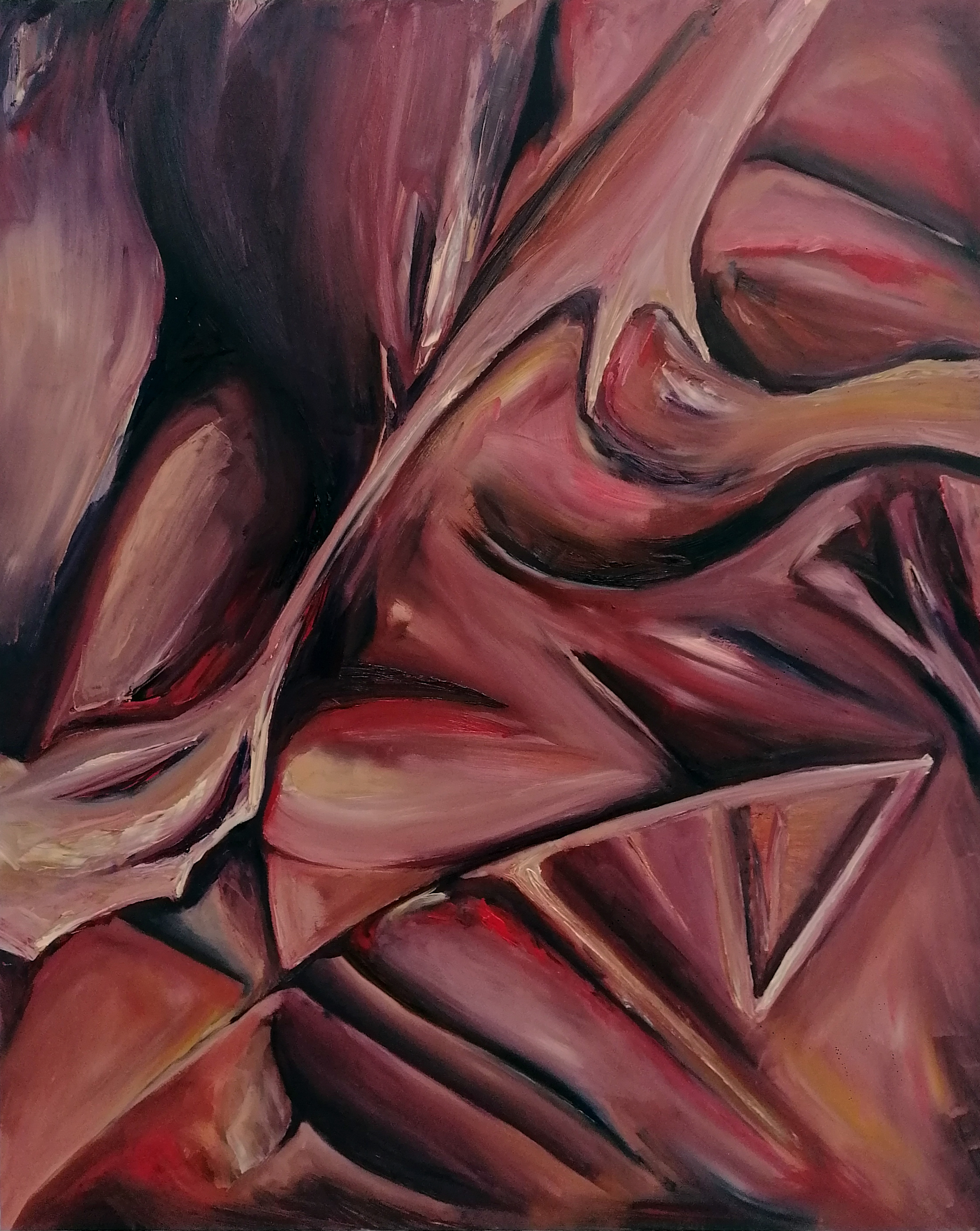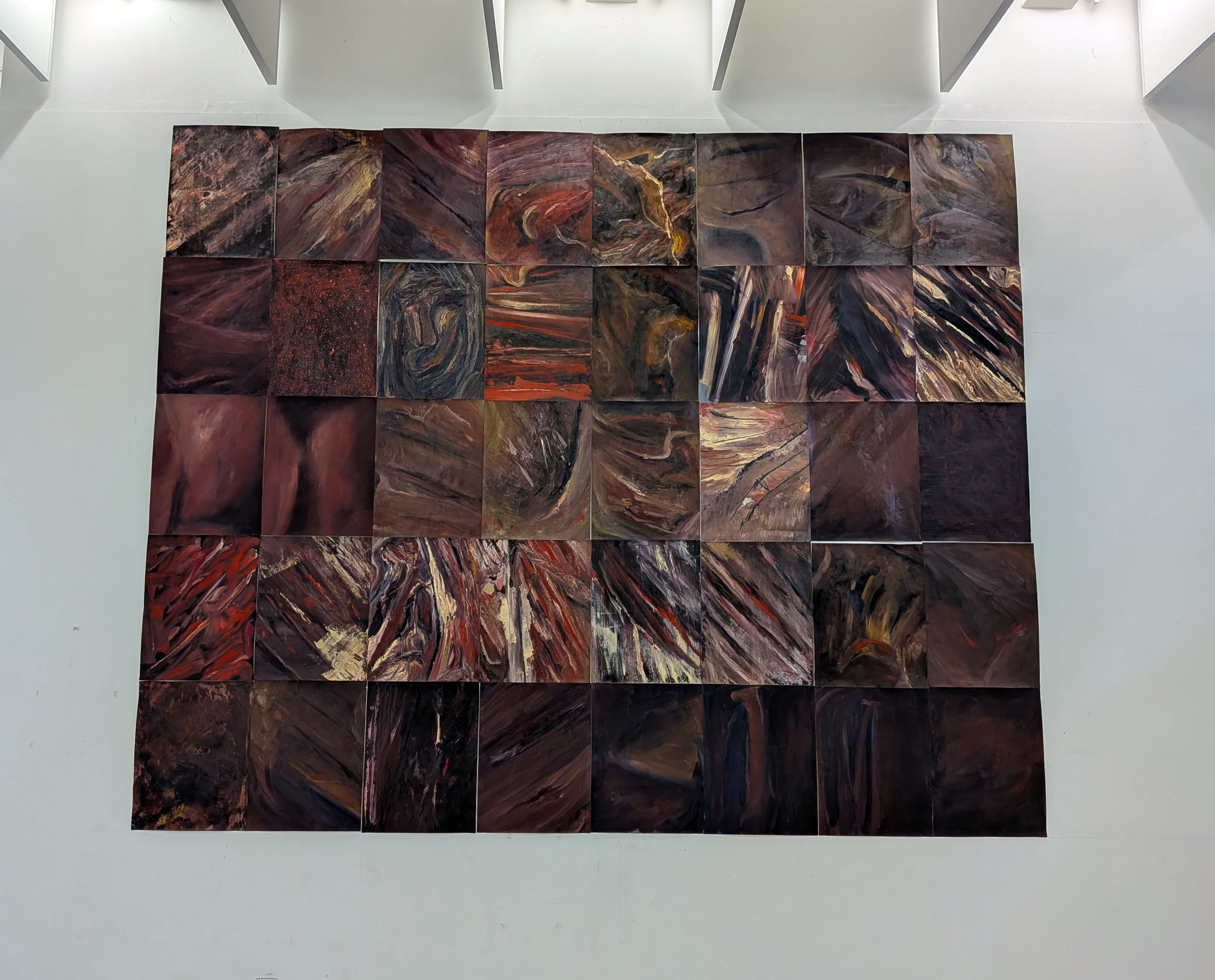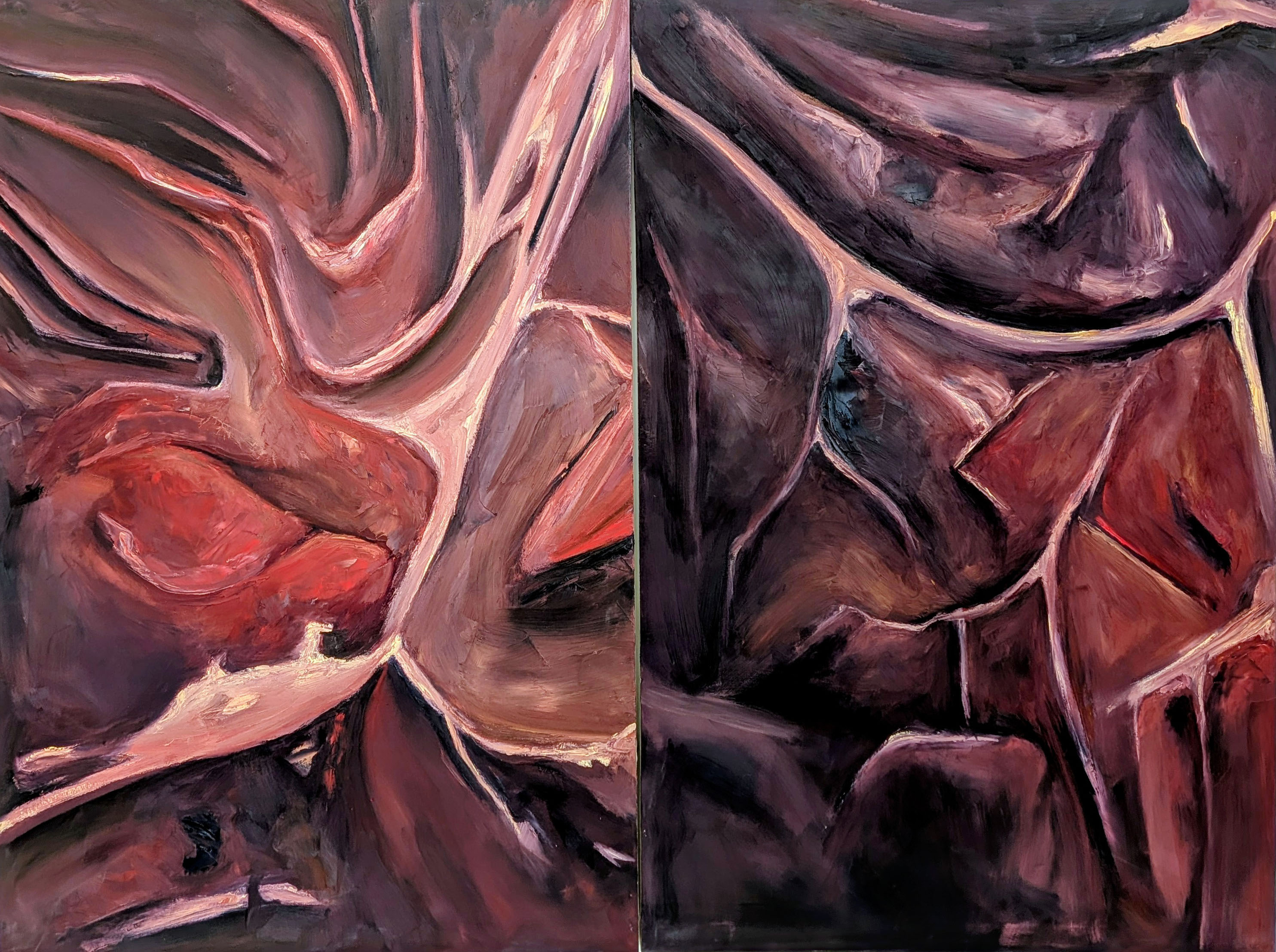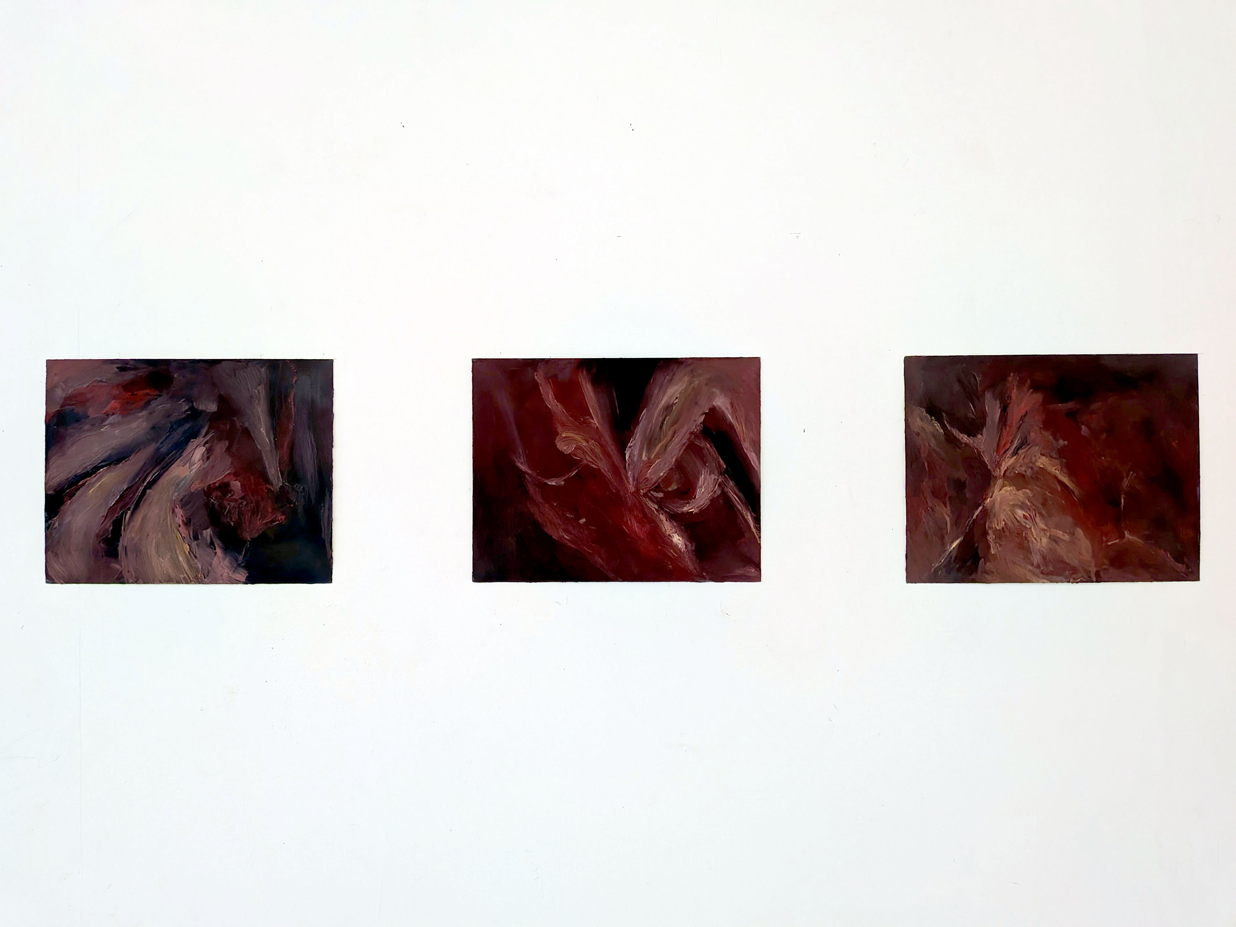 "Grossièrement, les teintes majoritairement rougeâtres ponctuées de jaune, de bleu et de vert s'entremêlent sans jamais se mélanger, forment sans jamais copier, montrent sans jamais obliger. Dans ses toiles, en reprenant le caractère des couleurs d'un morceau de viande avarié qui se gâte au fur et à mesure du temps, l’artiste Maxence Haution présente un regard critique sur le monde qui l'entoure. Il peint la viande, le sang et la chair avec honnêteté, sans pudeur, sans mensonge ; la peinture comme fenêtre d'un monde. Un regard Concret."