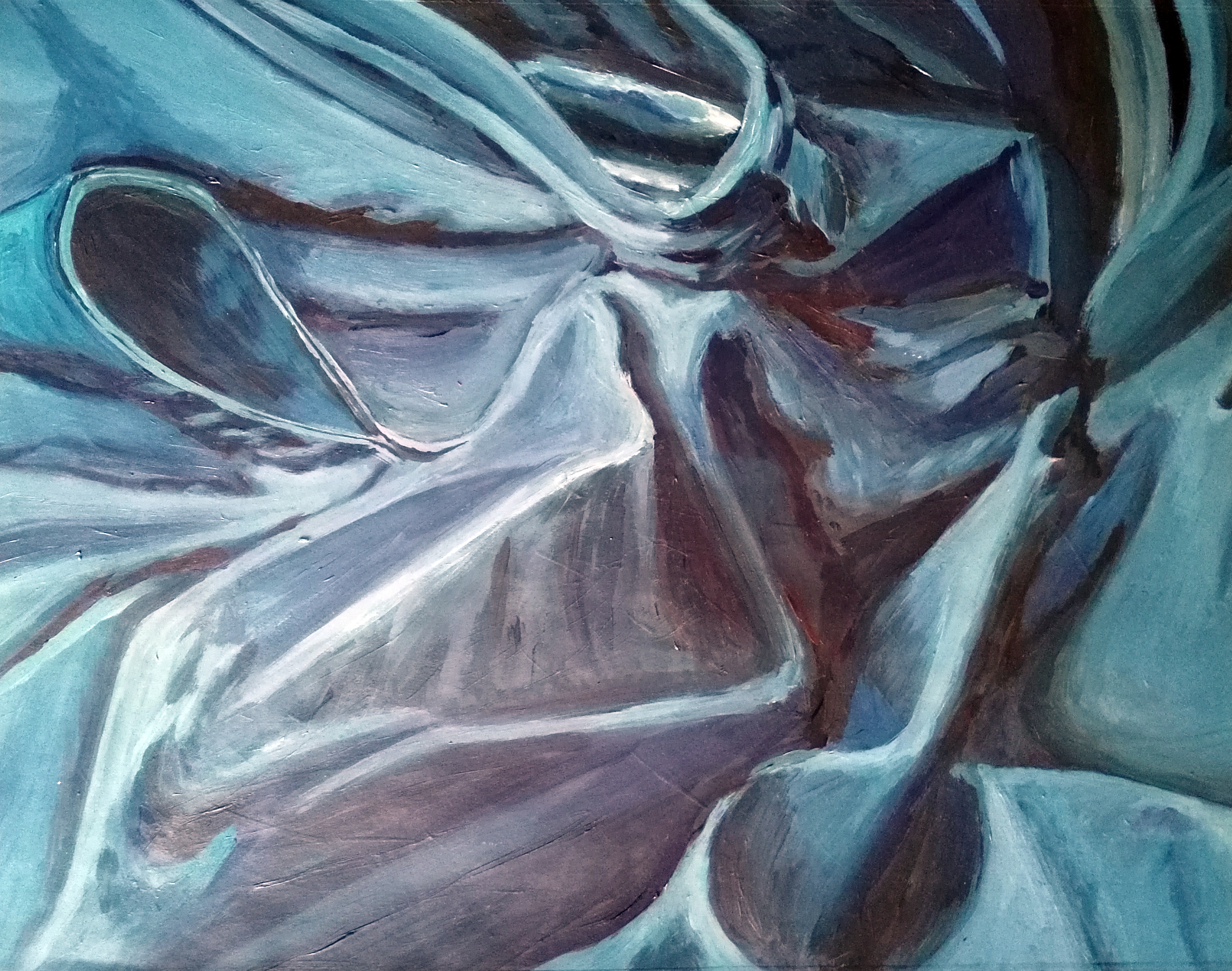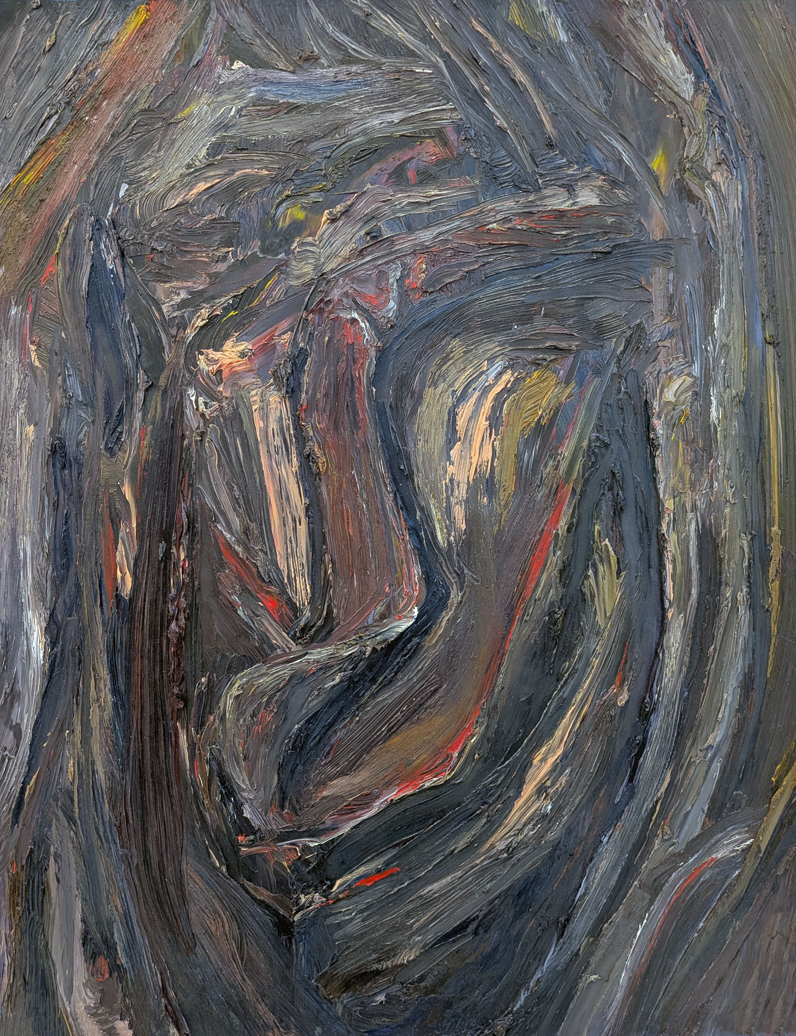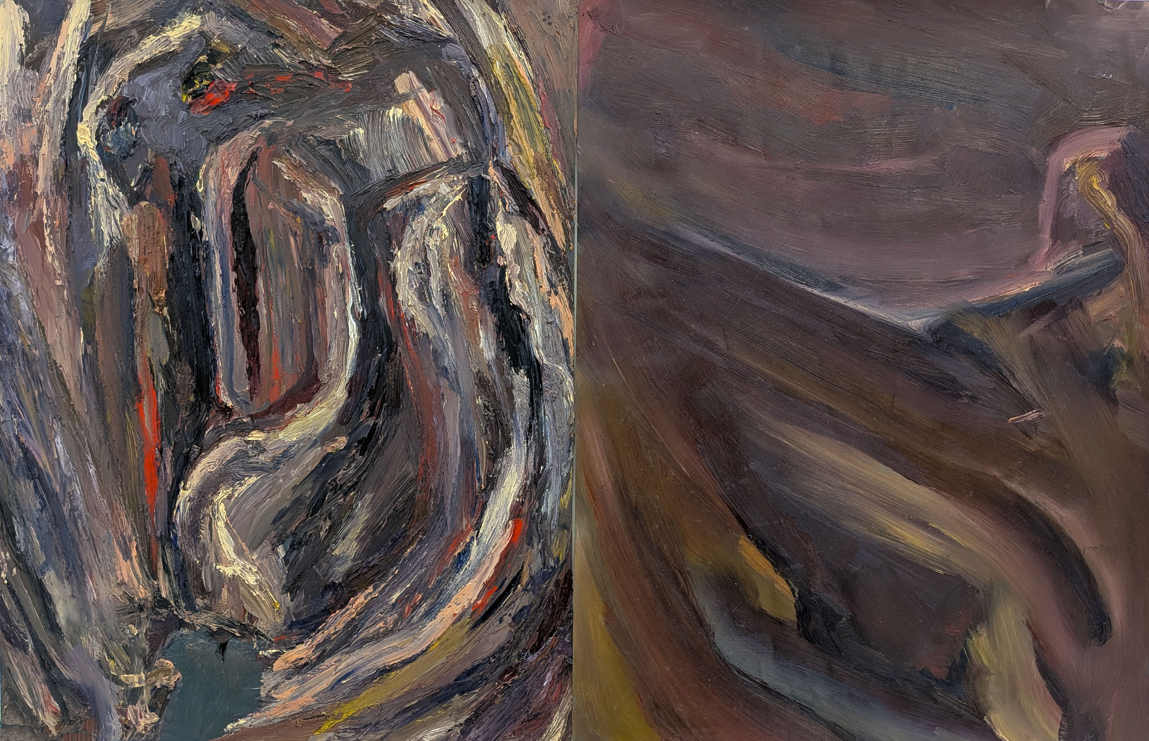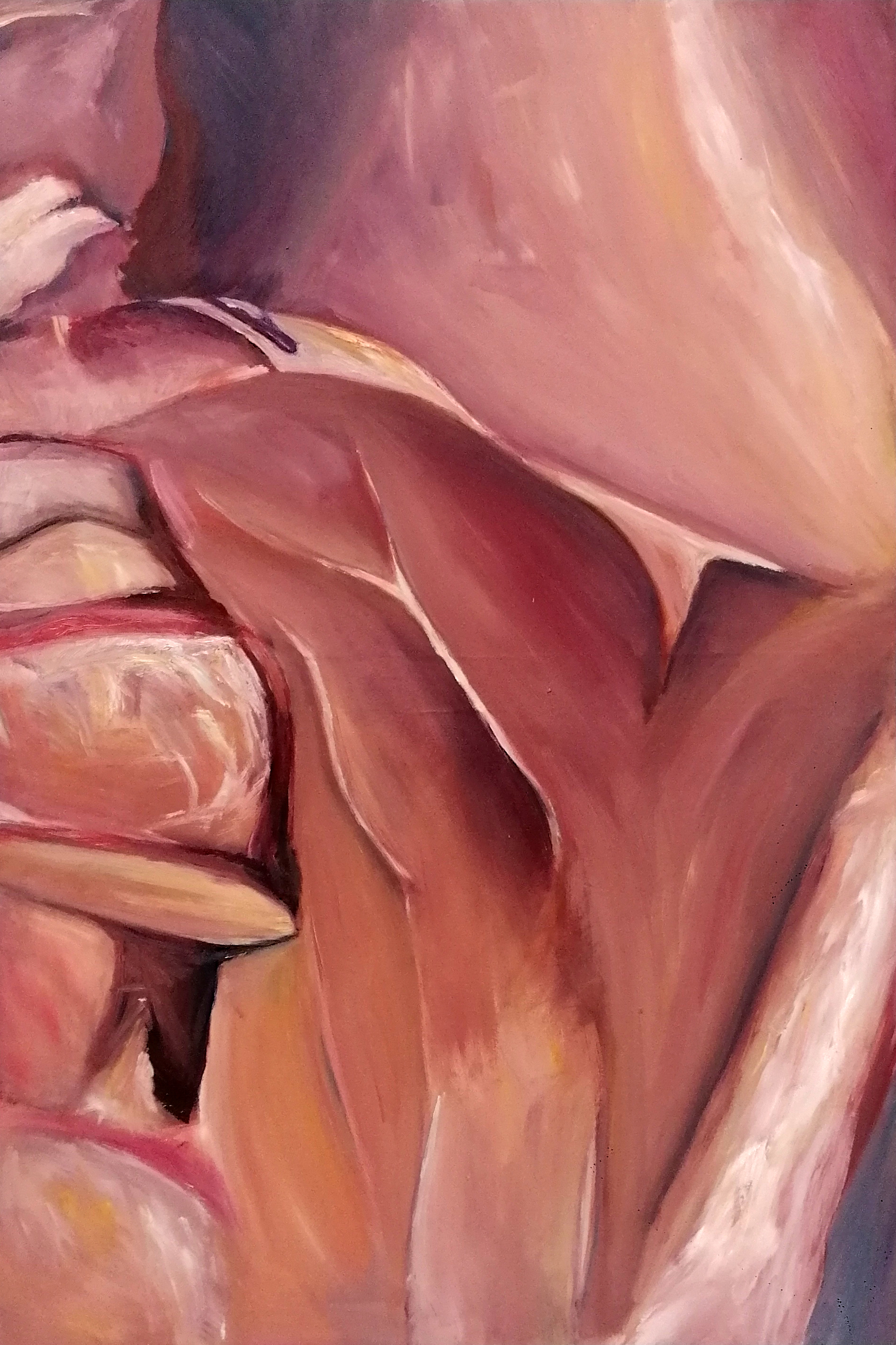 "Grossièrement, les teintes majoritairement rougeâtres ponctuées de jaune, de bleu et de vert s'entremêlent sans jamais se mélanger, forment sans jamais copier, montrent sans jamais obliger. Dans ses toiles, en reprenant le caractère des couleurs d'un morceau de viande avarié qui se gâte au fur et à mesure du temps, l’artiste Maxence Haution présente un regard critique sur le monde qui l'entoure. Il peint la viande, le sang et la chair avec honnêteté, sans pudeur, sans mensonge ; la peinture comme fenêtre d'un monde. Un regard Concret."